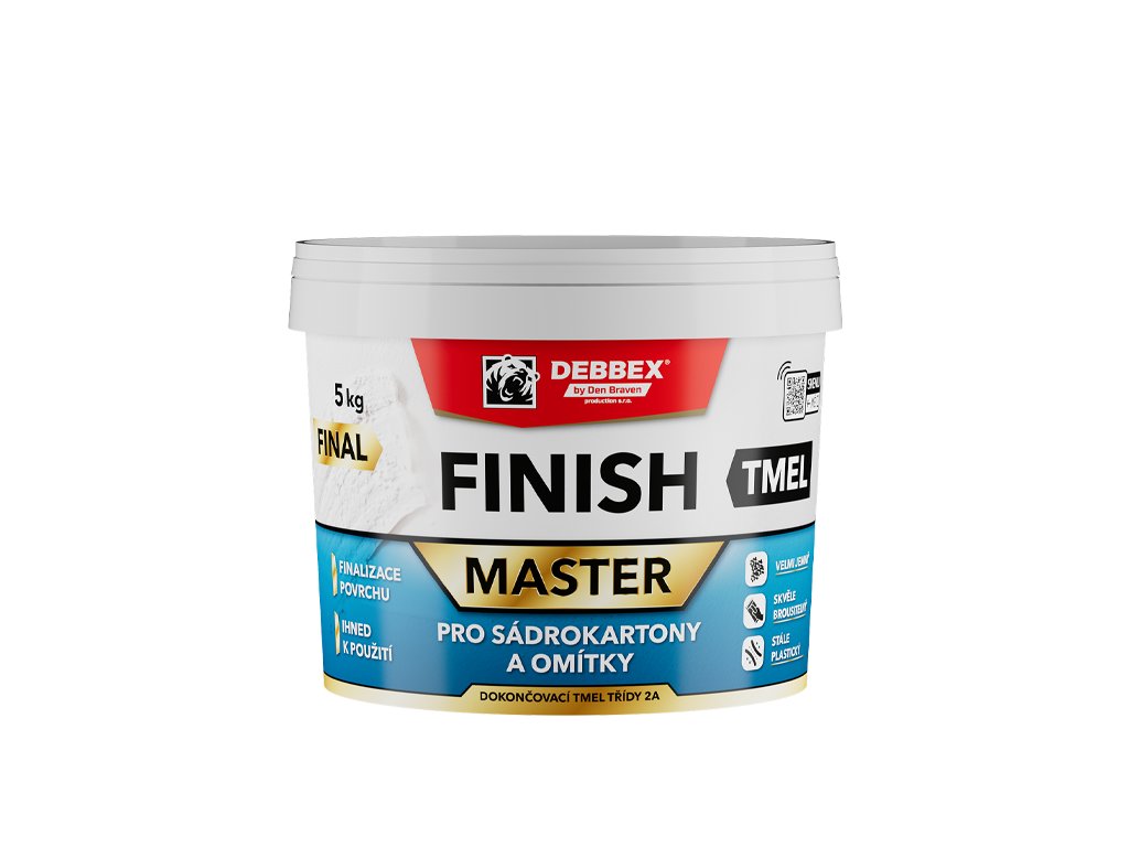 Jedná se o prémiový produkt s nízkým obsahem hrubých částic pro vytváření finálních vrstev při tmelení sádrokartonových desek. Tmel je ve formě pasty, po vyschnutí se lehce brousí. Je plně přetíratelný, je primárně určen pro finální tmelení sádrokartonových desek, avšak vzhledem ke svým skvělým vlastnostem, vysoké plasticitě a vysoké přídržnosti se používá nejen v oblastech sádrokartonů, ale i pro vyrovnání na stěnách, na opravy starých a popraskaných omítek s vlásečnicovými trhlinami, k opravám betonových povrchů stěn, má také vysokou přilnavost na dřevo a cihelné zdivo. Při použití v méně náročných objektech může nahrazovat pro svoji bělost základní malířský nátěr. Používá se v případě požadavku na vyšší kvalitu povrchu tmelených ploch bez tvorby vzduchových bublin.https://dokumentace.denbraven.cz/?p=16+Program+s%C3%A1drokart%C3%B3n%2FFinish+tmel+na+sa%CC%81drokartony