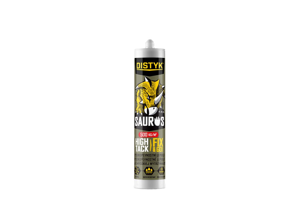 Pro mimořádně odolné lepené spoje již s maximální počáteční pevností. Přilepí i těžké předměty extrémní silou k podkladu, bez nutné fixace lepeného spoje. Pevnost v tahu po vytvrzení až 22 kg/cm 2 . Nahrazuje hřebíky, šrouby a nýty. Jedná se o speciální modifikaci MS polymerů, vytvářející po vytvrzení přetíratelný vysokopevnostní a elastický spoj. Není agresívní k podkladům, je ideální pro lepení zrcadel.https://dokumentace.denbraven.cz/?p=28+DISTYK+Line%2FSaurus+Glue+High+Tack+DISTYK+Line